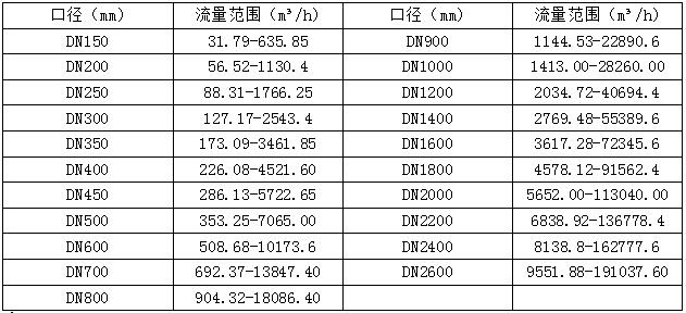 - 从经济性考虑,可以选择适当的流速所对应口径的流量计。(详见流量范围表)